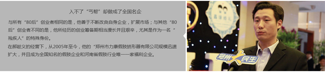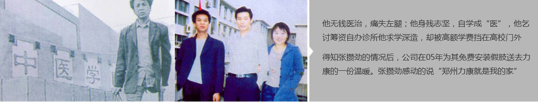 鄭州市力康假肢矯形器有限公司(簡(jiǎn)稱力康),是一家專業(yè)從事假肢矯形器的設(shè)計(jì)、研發(fā)、制作及裝 配的專業(yè)機(jī)構(gòu)。成立于1992年是河南省唯一一家福利企業(yè)。力康下設(shè)業(yè)務(wù)部、技術(shù)部、住院部、康復(fù) 部、售后服務(wù)部,并配有現(xiàn)代化的裝配車間和功能齊全的訓(xùn)練大廳,為殘疾朋友康復(fù)訓(xùn)練提供了可靠 保障。總經(jīng)理穿戴假肢多年,有著豐富的臨床經(jīng)驗(yàn)和親身體會(huì);多年來(lái),力康已為全國(guó)幾十萬(wàn)名殘疾 朋友安裝上舒適、美觀、耐用的假肢和矯形器具,使他們更大限度地恢復(fù)了正常的工作和生活。“產(chǎn) 品即人品”的質(zhì)量理念、先進(jìn)的技術(shù)、實(shí)惠的價(jià)格、完善的售后服務(wù)是力康取勝的法寶……